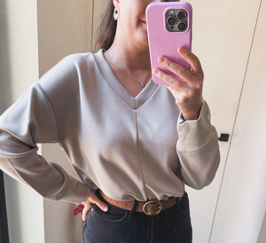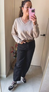 PasvormValerie is 1m68 en draagt maat 36/S.Het truitje valt oversized.Materiaal48% Modal, 48% Polyester, 4% Elastaan